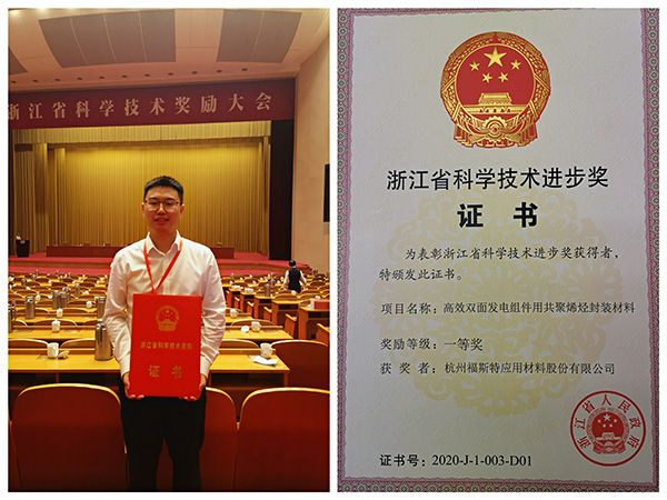 6月15日下午,浙江省科學(xué)技術(shù)獎(jiǎng)勵(lì)大會(huì)在浙江省人民大會(huì)堂隆重舉行,由杭州福斯特應(yīng)用材料股份有限公司和浙江大學(xué)共同完成的 “高效雙面發(fā)電組件用聚烯烴封裝材料”項(xiàng)目榮獲浙江省科技進(jìn)步一等獎(jiǎng)。