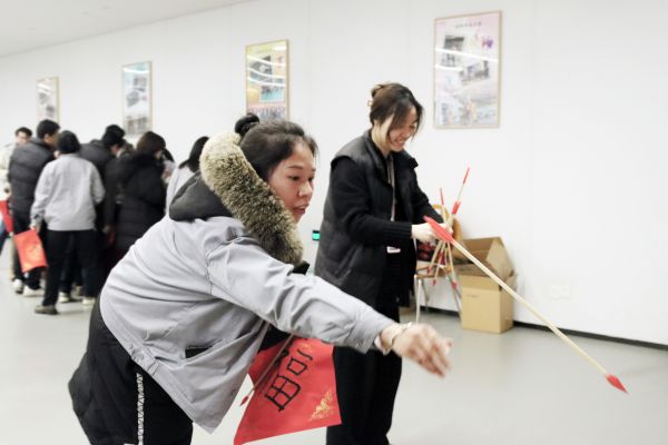與此同時,寫福字、夾“湯圓”、投壺項目也在如火如荼地進行。“寫福字、沾福氣、納百福”,祈愿福運當頭、萬事順遂;投壺作為一項傳統的娛樂活動,具有送祝福的寓意,體現了人們對美好生活的向往;夾“湯圓”則是在規(guī)定時間內將“湯圓”夾入碗中,象征幸福團圓。職工們體驗完成四個項目,紛紛到禮品兌換處挑選自己心儀的小禮品,大家其樂融融、盡興而歸。