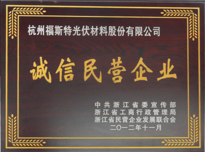 熱烈祝賀福斯特獲中共浙江省委宣傳部、浙江省工商行政管理局、浙江省民營企業發展聯合會授予“誠信民營企業”稱號。