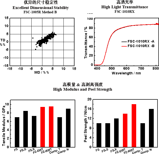 福斯特?zé)o膠型單面板,采用自主研發(fā)的熱固性聚酰亞胺、熱塑性聚酰亞胺作為絕緣材料,在銅箔上經(jīng)過(guò)涂布、亞胺化等工序生產(chǎn)得到。產(chǎn)品具有高剝離強(qiáng)度和高拉伸強(qiáng)度,優(yōu)異的尺寸穩(wěn)定性和良好的耐熱性,可用于制造高性能單面板和多層板。根據(jù)客戶(hù)端不同的應(yīng)用需求與應(yīng)用場(chǎng)景,設(shè)計(jì)了具有不同特性的產(chǎn)品系列。
